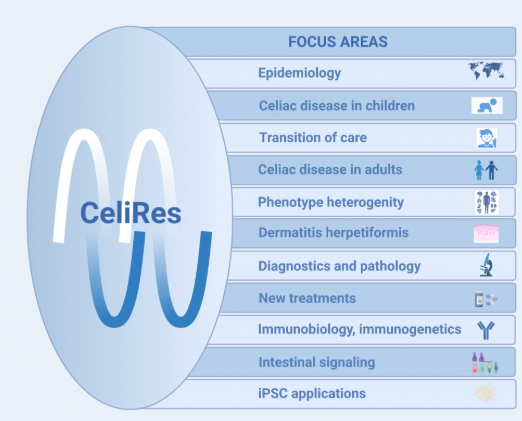 The research setting of CeliRes involves multidisclipinary collaboration between gastroenterologists, pediatricians, dermatologists, basic researchers and geneticists. The focus areas investigated in CeliRes are presented in the figure and range from epidemiology to clinical studies and drug trials and further to basic research.